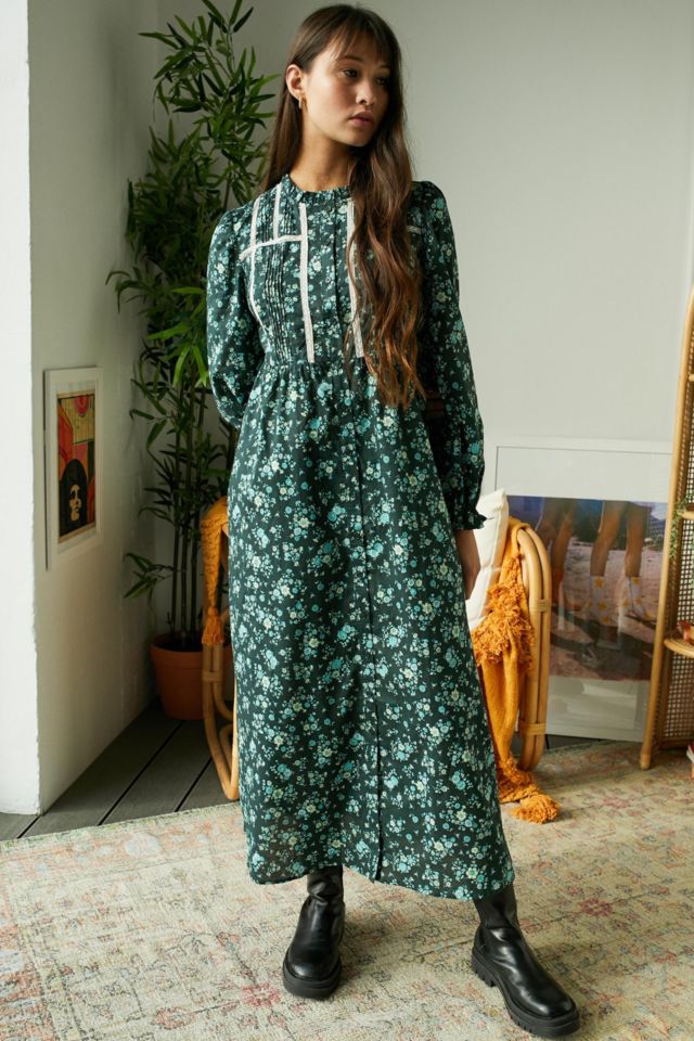 Meadow maxi dress. An all over floral pattern long sleeves a full button placket and broderie details to. Covered elastic at the neckline for styling on or off the shoulder. Feminine ruffle details accent the hem and neckline of our wrap style Meadow Ruffle Maxi Dress.